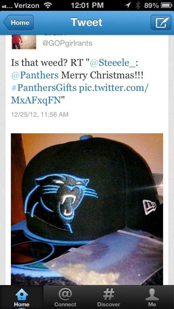 @Panthers ummm you know you just retweeted a bag of weed in that picture along with the panthers hat right #merrrychristmas
