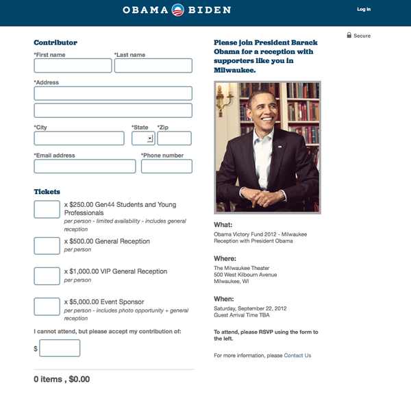 But Twitter users didn’t see anything of the sort. It’s just a boilerplate Obama-Biden donation page inviting supporters to attend a reception with Obama in Milwaukee: “Please join President Barack Obama for a reception with supporters like you in Milwaukee.”